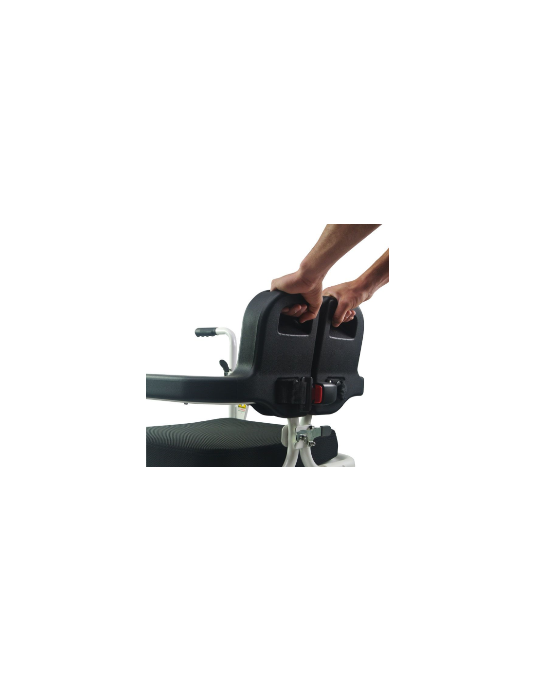 Al igual que la silla moovy estándar, permite hacerse cargo fácilmente, sin esfuerzo para el cuidador y sin riesgo de dolor para el paciente. Permite trasladar a los pacientes de la cama a la ducha o al inodoro. Si se va usar en la ducha, retire la batería antes de iniciar la ducha.