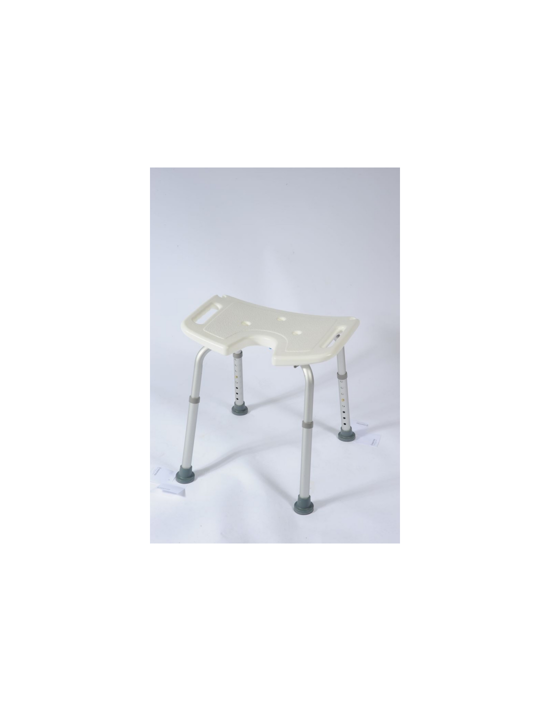 Taburete para la ducha con abertura en el asiento en la parte delantera, asas en los laterales anatómicas4 y regulable en altura en 8 posiciones.