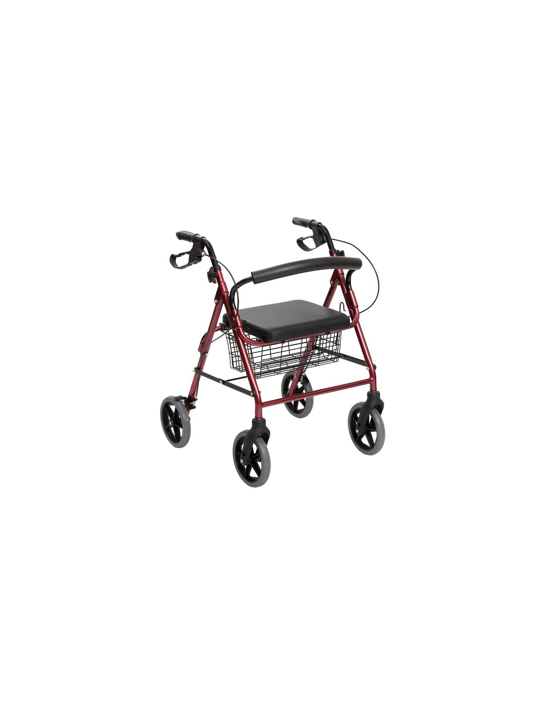 Andador de aluminio ligero y ergonómico con 4 ruedas con bloqueo. Empuñaduras regulables en altura, asiento acolchado y cesta metálica.