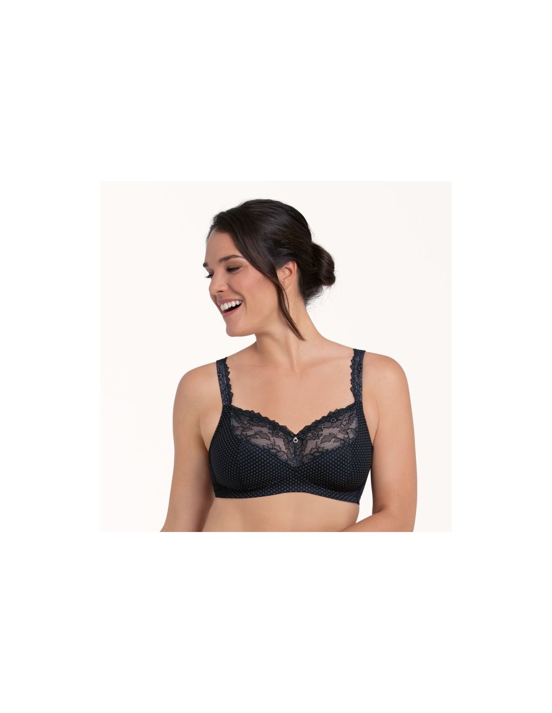 ELOISE combina elegancia femenina con funcionalidad inteligente. Un delicado encaje floral de hilo reciclado adorna la copa superior, los tirantes y la copa inferior. Un moderno estampado de lunares aporta un contraste fresco al diseño. Las copas divididas en tres partes con una costura transversal, el tul reforzado en la copa superior y la charmeuse suave en la inferior brindan sujeción segura. Los bolsillos para prótesis a ambos lados, los tirantes más anchos en tallas grandes y una espalda firme aseguran una gran comodidad. Un pequeño detalle decorativo en el escote aporta un toque elegante. Ideal para el día a día con un plus de estilo.