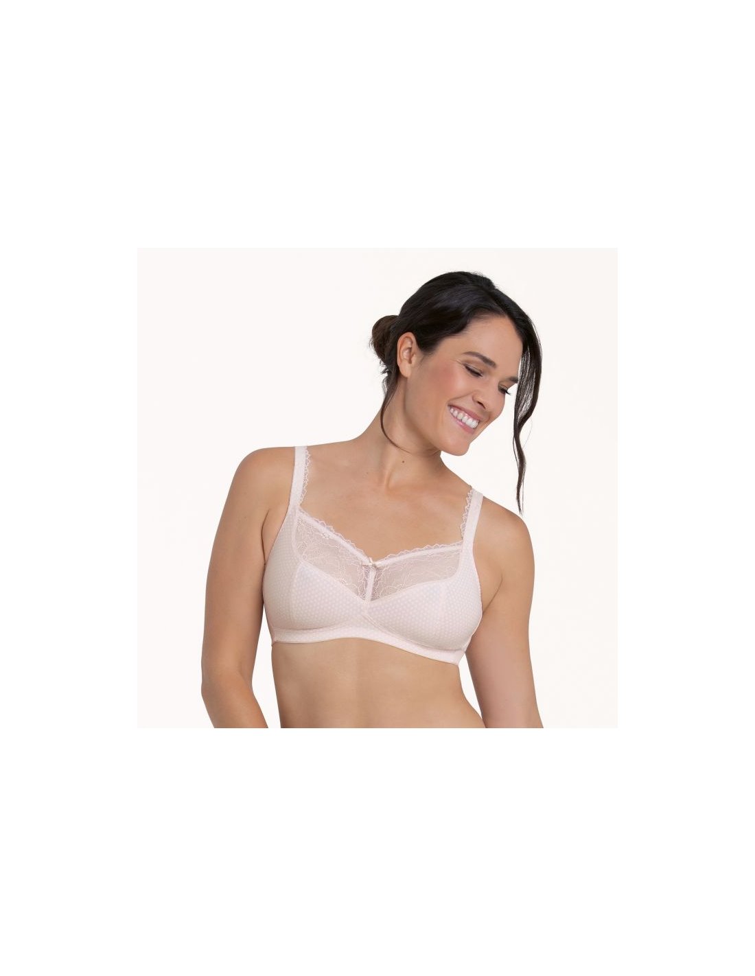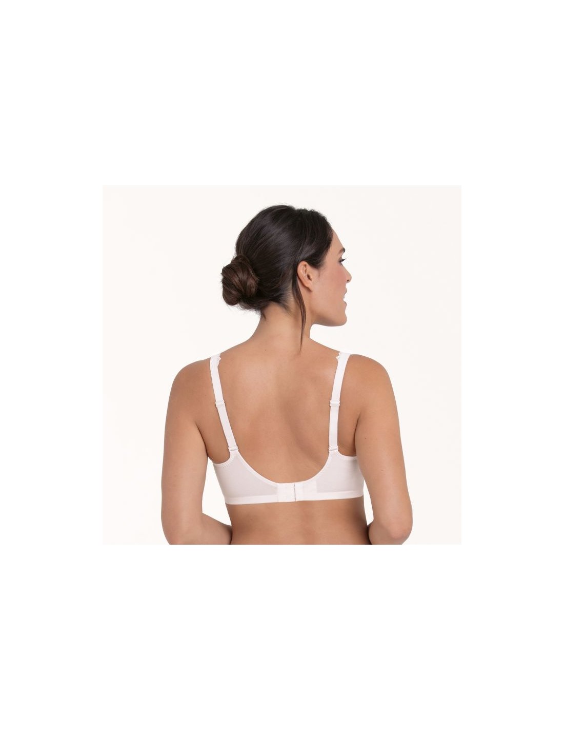 Sujetador protésico con fundas de algodón en la parte inferir de la copa y en la parte superior de fino tul. Encaje floral de hilo reciclado. Encaje elástico en la parte superior de la copa. Cierre regulable en 4 posiciones para una optima sensación de confort.