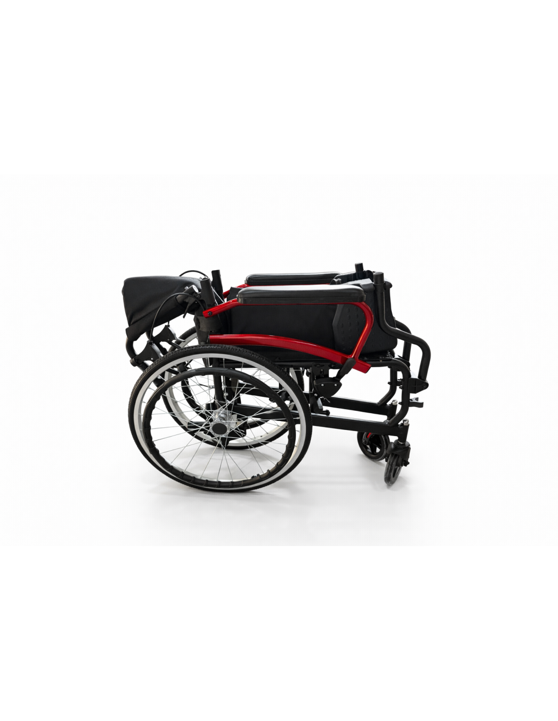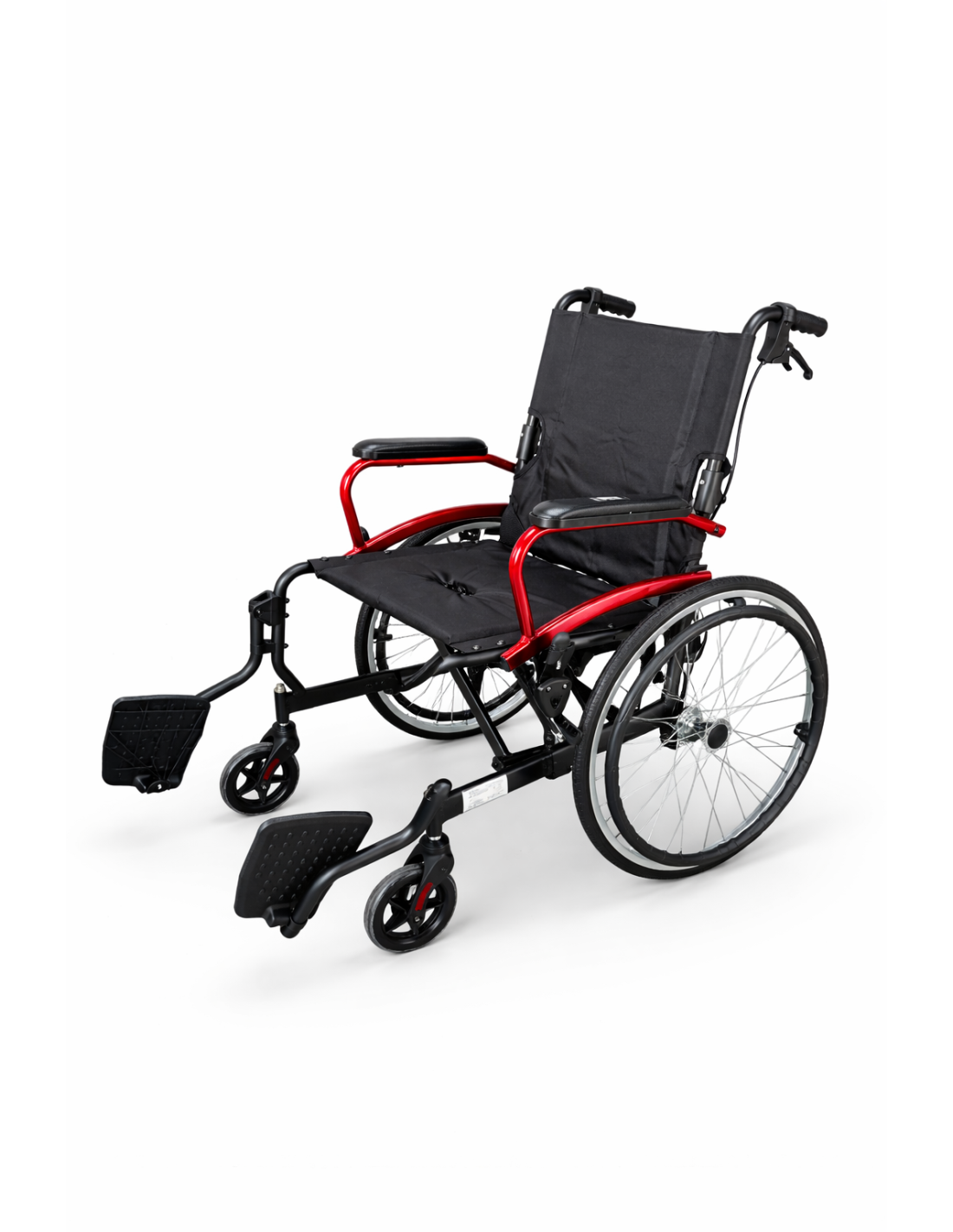Silla de ruedas fabricada en aluminio, lo que la hace ligera, resistente y fácil de maniobrar. Su estructura ofrece buena durabilidad sin añadir peso innecesario, facilitando tanto el transporte como el uso diario.
