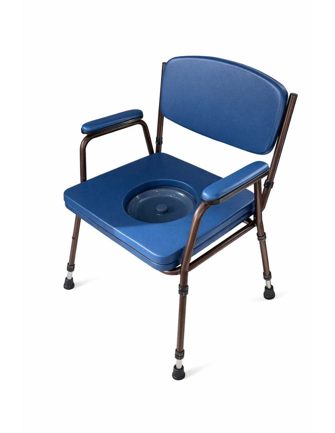 Silla de habitación con inodoro, regulable en altura, esta diseñado para facilitar la higiene personal de personas con movilidad reducida. Cuenta con estructura de acero resistente, asiento, respaldo y brazos tapizados para mayor confort, y un inodoro integrado cuya altura se puede ajustar según las necesidades del usuario, combinando seguridad, comodidad y funcionalidad en un solo diseño.