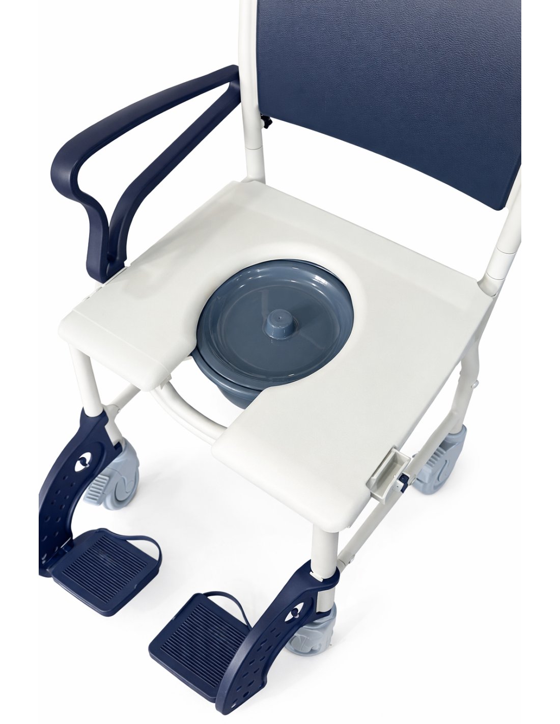 Silla de ducha con inodoro, reposabrazos abatibles, ruedas de transporte con freno y cubeta extraíble. Asiento y respaldo acolchados.