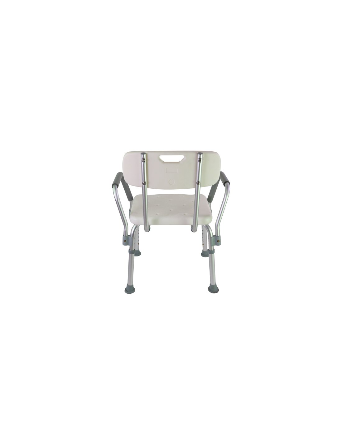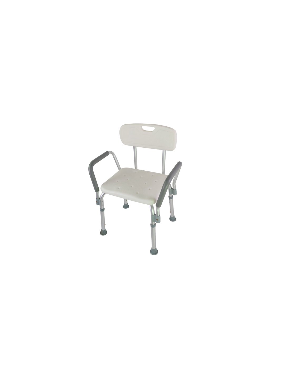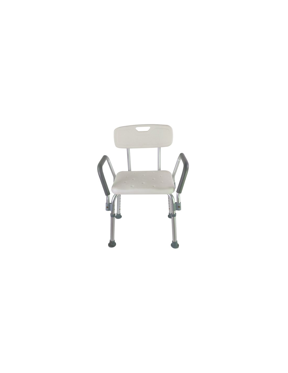 Taburete de baño con respaldo y apoyabrazos, fabricado en aluminio resistente al agua. Cuenta con asiento anatómico con drenaje, altura ajustable y regatones antideslizantes que brindan mayor seguridad y estabilidad. Ideal para adultos mayores, personas con movilidad reducida y uso doméstico o institucional.