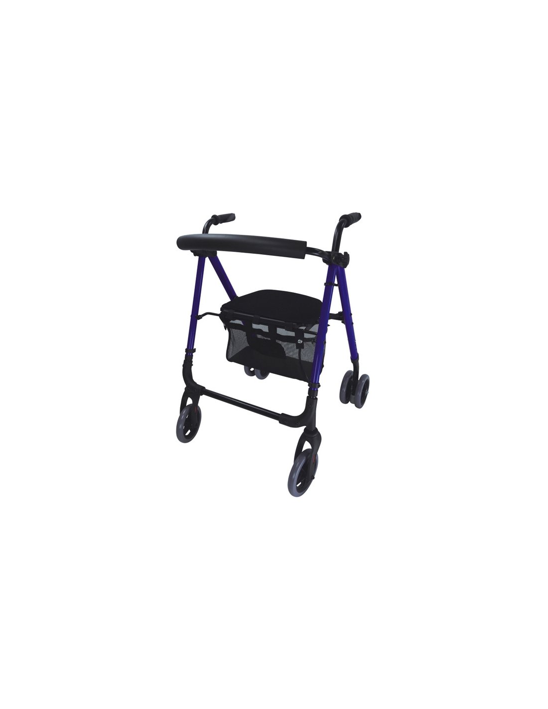 Andador azul con freno por presión, ligero y plegable, con asiento acolchado, respaldo y bolsa portaobjetos para mayor seguridad y comodidad en el uso diario.