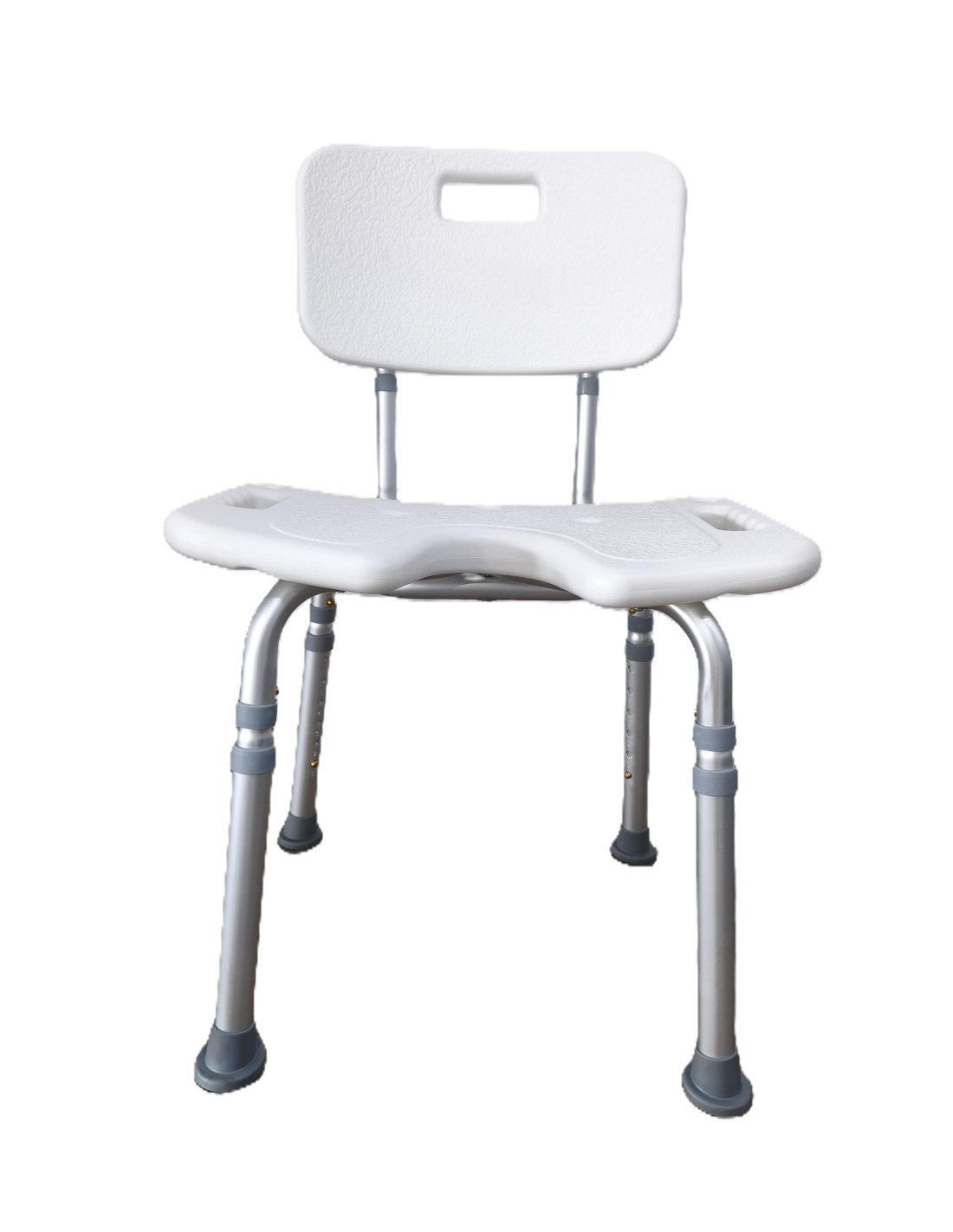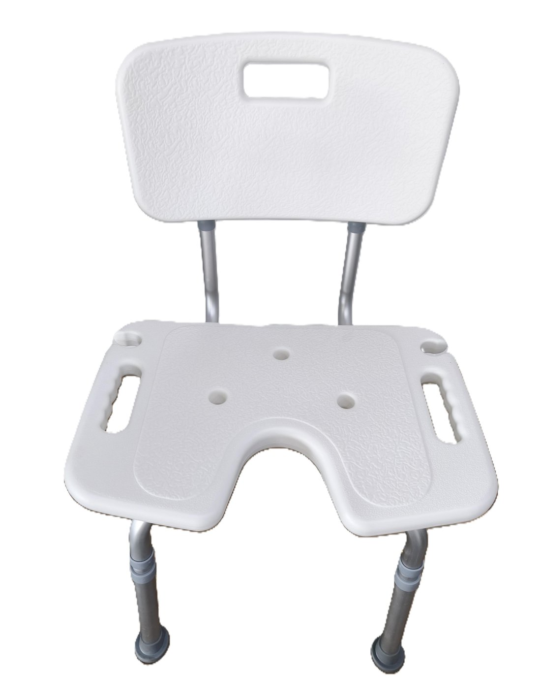 Taburete de baño con respaldo y asiento en forma de U, fabricado en aluminio ligero y resistente. Superficie antideslizante, orificios de drenaje y altura regulable, ideal para una higiene segura y cómoda.