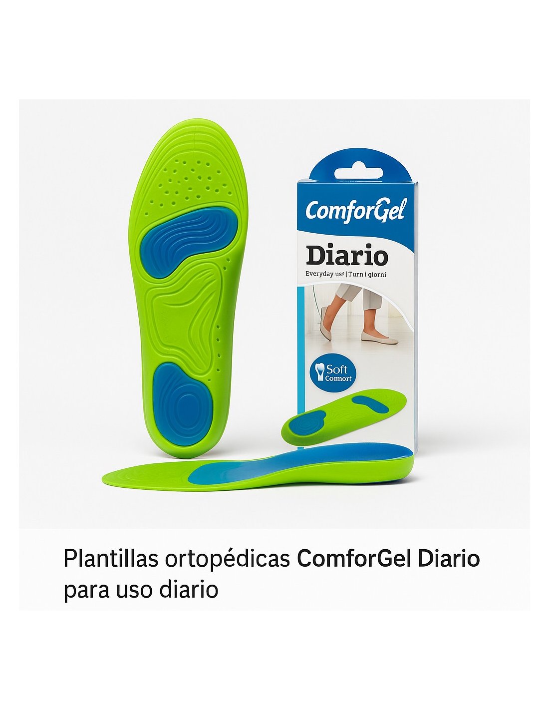 Las plantillas ortopédicas ComforGel Diario están especialmente diseñadas para ofrecer comodidad y soporte en el uso cotidiano, ideales para quienes realizan actividades ligeras o moderadas a lo largo del día. Su tecnología Soft Comfort amortigua cada paso, ayuda a reducir la fatiga plantar y mejora la pisada, favoreciendo una postura saludable sin añadir volumen al calzado.