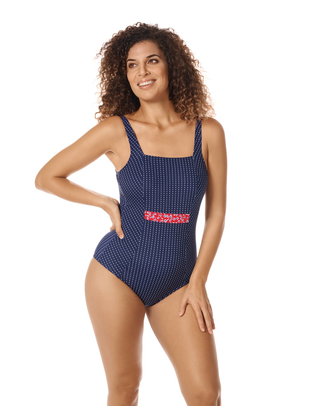 Bañador protésico Amoena Algarve, con fundas bilaterales y diseño azul marino con estampado de lunares. Elegante, cómodo y perfecto tras mastectomía